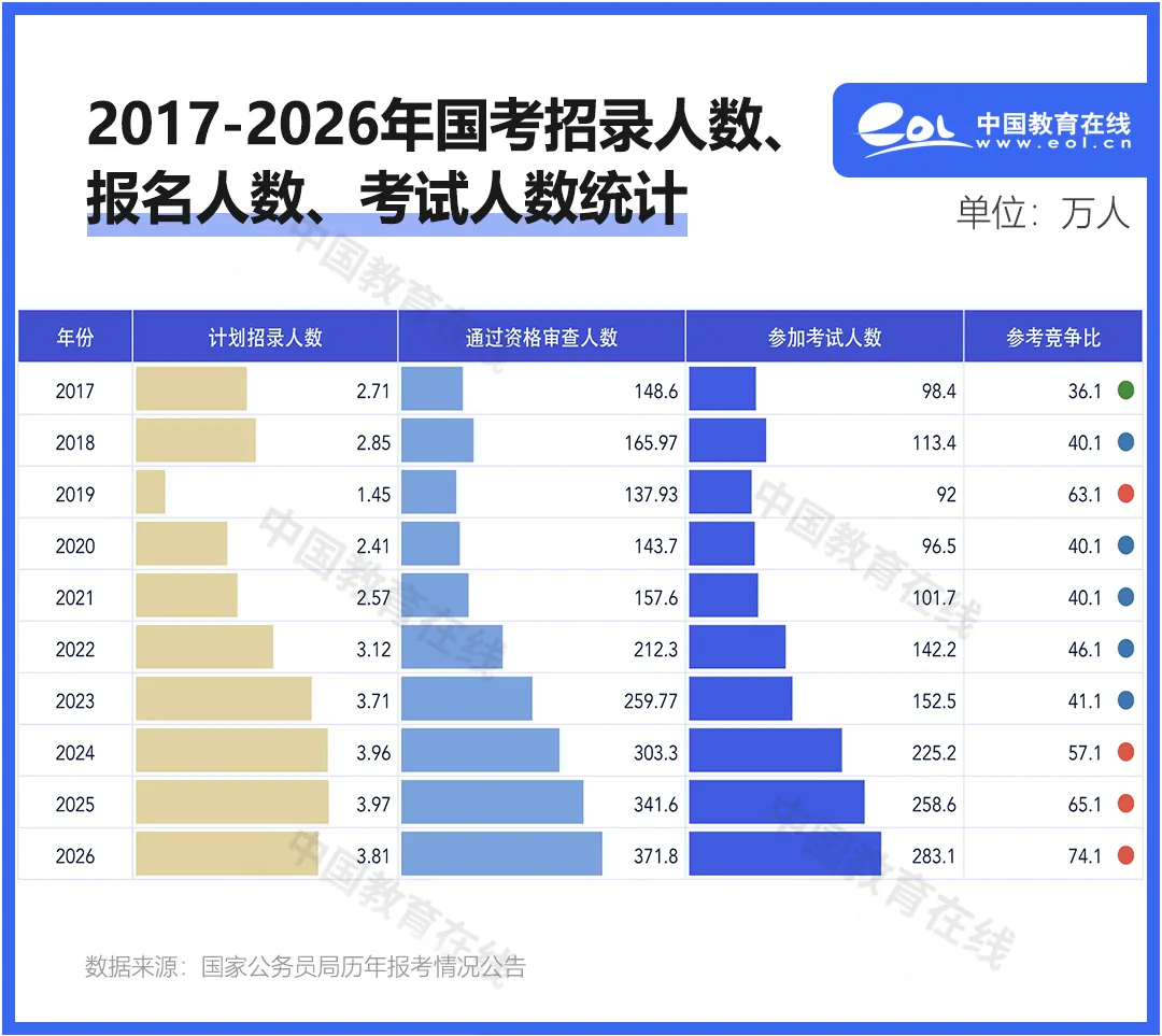 11月30日,2026年公務(wù)員國考開考,通過資格審查的報(bào)名人數(shù)371.8萬人(實(shí)際參考人數(shù)為283.1萬人),共計(jì)劃招錄3.81萬人,比去年減少0.16萬人,錄取比74:1,比去年的65:1有明顯增長。
